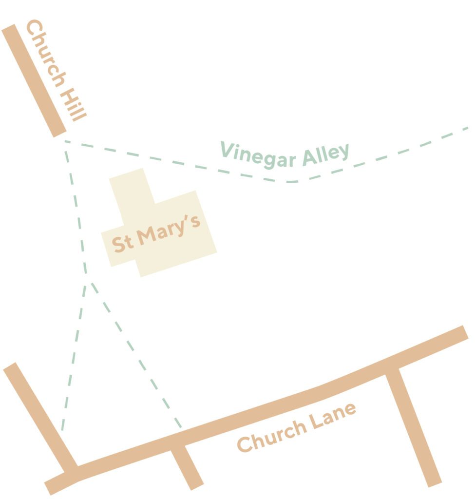 As you stand in this bit of the churchyard, it also worth noting that some people claim there were medieval plague pits in this area, which ultimately led to it being given the name, ‘Vinegar Alley’, as vinegar was used as a disinfectant; however, others believe that the name ‘Vinegar Alley’ was simply a corruption of the word, ‘vineyards’, which may have existed in this area at one time. Another theory is that there was once a nearby tanner, which gave off a vinegar smell.
